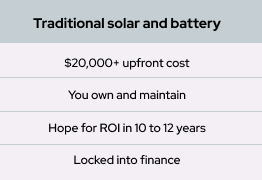 The answer is simple: there is no catch. We partner with energy retailers who offer plans that allow you to pay only for the power you use, which costs less than traditional grid power because the energy retailer sells you some of the energy from the solar system on your home. By joining our network, you're saving money and participating in an innovative approach to reducing energy costs for everyone.